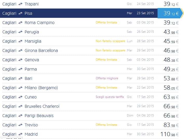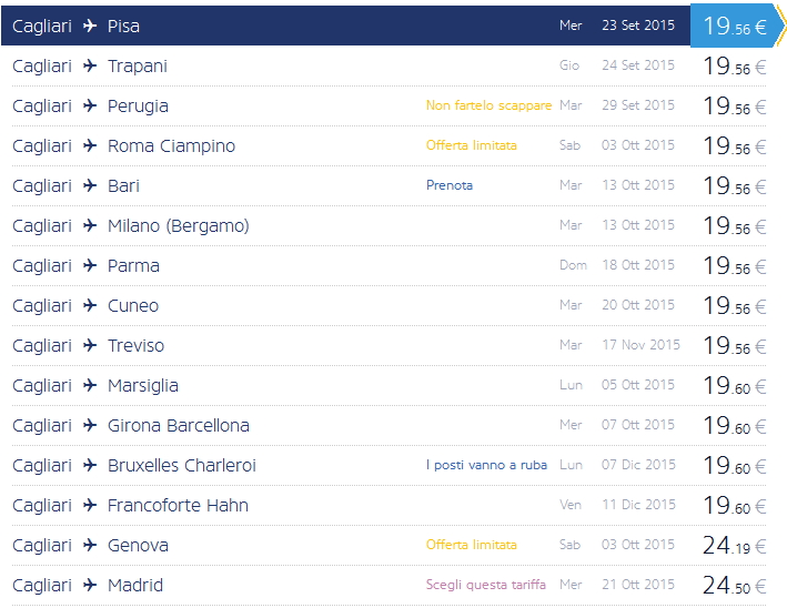 I VOLI IN SVENDITA RYANAIR DA CAGLIARI A PARTIRE DA 19,56 € – GIOVEDI 6 AGOSTO 2015 Reviewed by admin on . Ecco le svendite Ryanair di oggi, giovedi 6 agosto 2015: ci sono tantissimi voli da settembre  a dicembre  a partire da 19,56 €. E’ un metodo che assomiglia tan Ecco le svendite Ryanair di oggi, giovedi 6 agosto 2015: ci sono tantissimi voli da settembre  a dicembre  a partire da 19,56 €. E’ un metodo che assomiglia tan Rating: 0