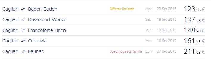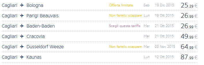 Dando un’occhiata alle offerte da Cagliari, si possono trovare voli per Milano, Barcellona Girona, Madrid, Baden, Kaunas,Cracovia e altre destinazioni a pochi euro.