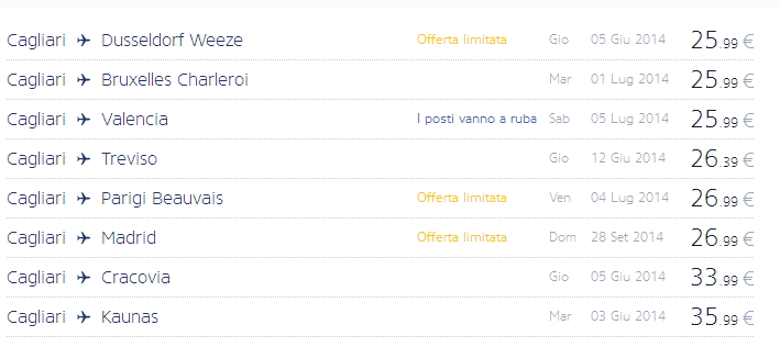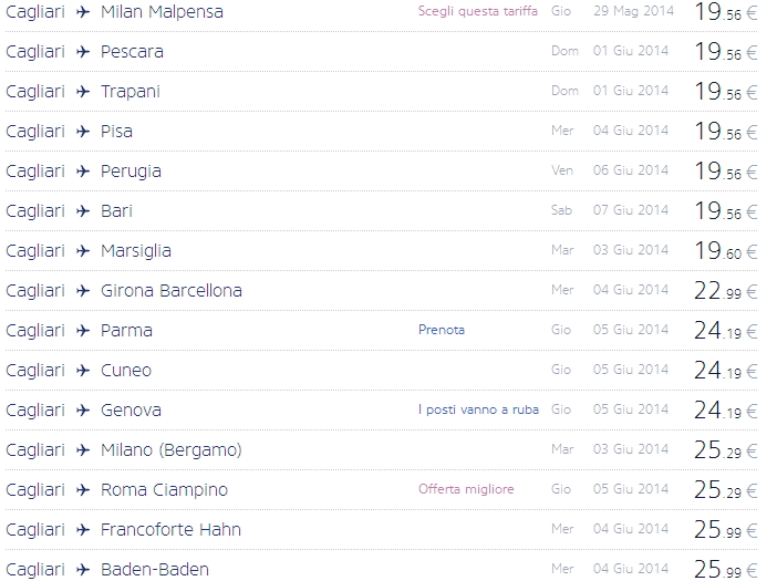 Dando un’occhiata alle offerte da Cagliari, si possono trovare voli per Milano, Barcellona Girona, Madrid, Baden e altre destinazioni a pochi euro.