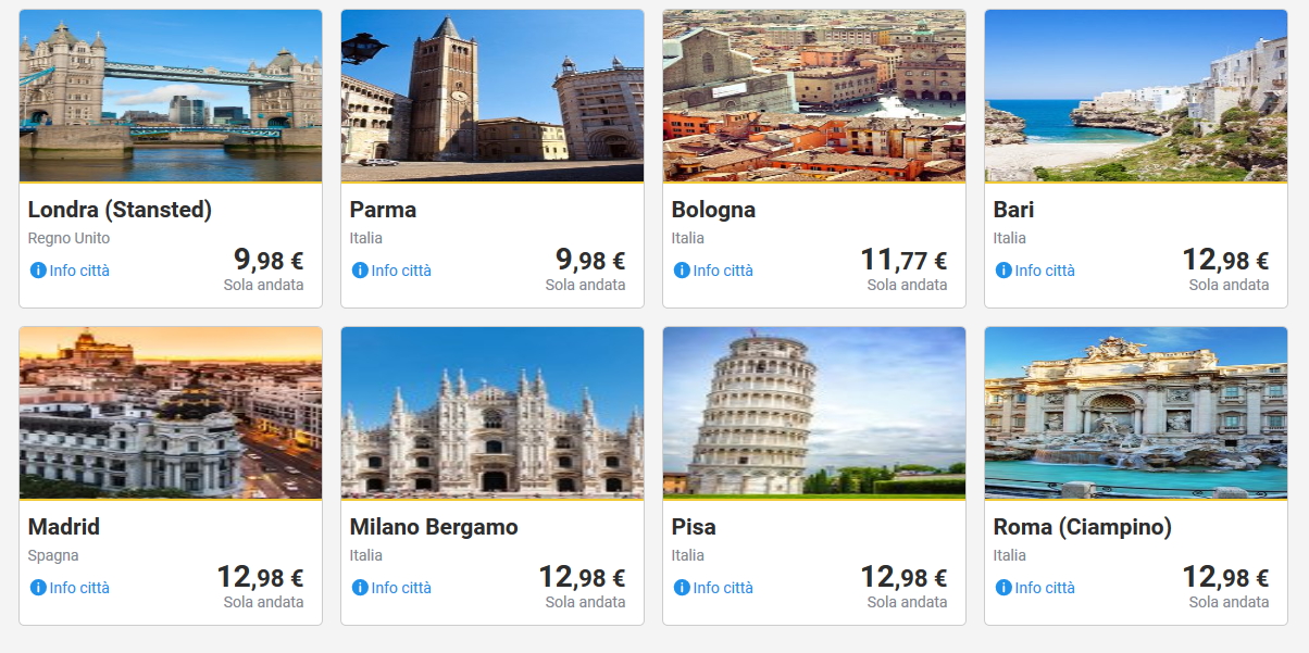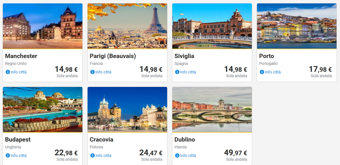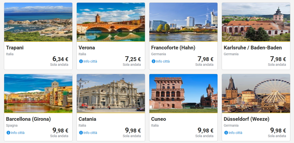 Ecco le svendite Ryanair di oggi, giovedi 7 FEBBRAIO 2019: ci sono tantissimi voli da MARZO A GIUGNO 2019 a partire da 6,34 €. Dando un’occhiata alle offerte da Cagliari, si possono trovare voli per Milano, Bari,Pisa, Verona,Parma, Roma, Francoforte, Parigi, Bruxelles, Cracovia e grande novità Budapest, Oporto, Siviglia, Valencia, Londra Luton e Manchester a pochi euro. Per trovare la schermata di queste offerte dovete cercare nel sito Ryanair la voce “Trova Tariffe” e selezionare Cagliari come aeroporto di partenza e ovunque per l’aeroporto di arrivo: il budget da scegliere sarà meno di 50 euro.