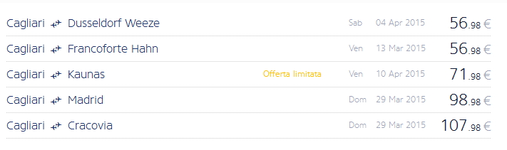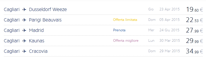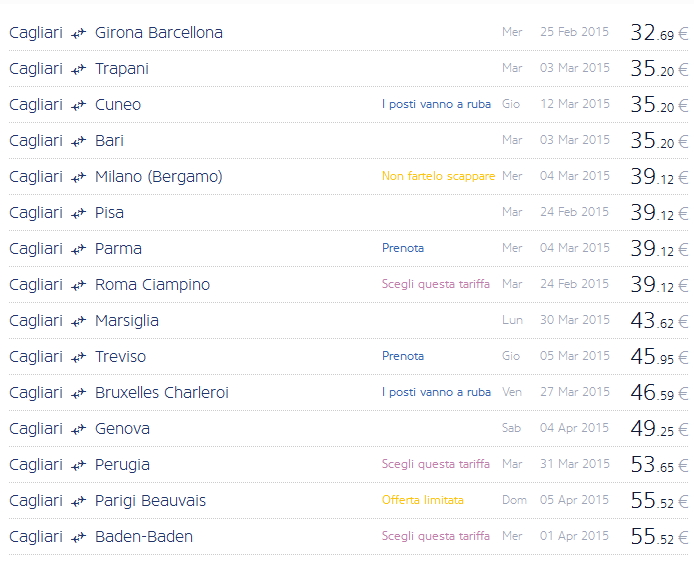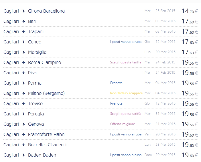 Da segnalare il volo Cagliari-Barcellona Girona del 25 febbraio che costa  14,70 € e i voli per Bari e Trapani a 17,60€