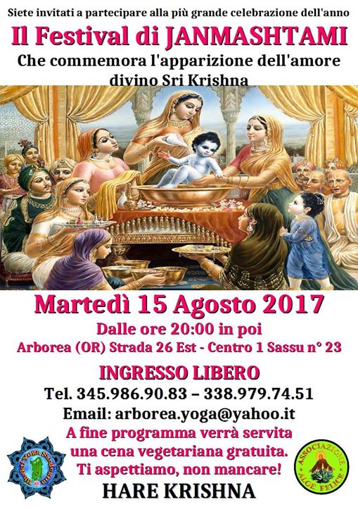 IL FESTIVAL DI JANMASHTAMI – ARBOREA – MARTEDI 15 AGOSTO 2017 Reviewed by admin on . ARBOREA. 15 AGOSTO IL FESTIVAL DI JANMASHTAMI : Eventi NOTA STAMPA L'Associazione Hare Krishna, in collaborazione con Aloe Felice, organizza martedi' 15 agosto ARBOREA. 15 AGOSTO IL FESTIVAL DI JANMASHTAMI : Eventi NOTA STAMPA L'Associazione Hare Krishna, in collaborazione con Aloe Felice, organizza martedi' 15 agosto Rating: 0