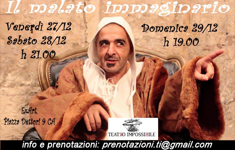 IL MALATO IMMAGINARIO – EX LICEO ARTISTICO – CAGLIARI – 27-28-29 DICEMBRE 2013THE PATIENT IMAGINARY – EX HIGH ART SCHOOL – CAGLIARI – DECEMBER 27-28-29 Reviewed by admin on . Per info e prenotazioni: prenotazioni.ti@gmail.com Il malato Immaginario Ven 27 e Sab 29 dicembre, ore 21 con: Elio Turno Arthemalle, Valentina Fadda, Felice Co Per info e prenotazioni: prenotazioni.ti@gmail.com Il malato Immaginario Ven 27 e Sab 29 dicembre, ore 21 con: Elio Turno Arthemalle, Valentina Fadda, Felice Co Rating: