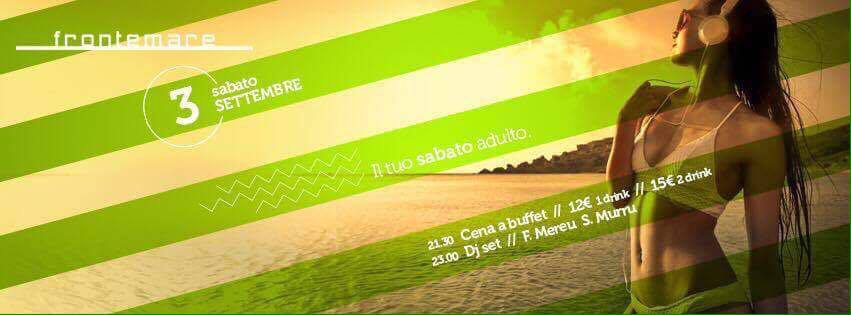 un altro appuntamento con il sabato al FRONTEMARE…. il tuo SABATO ADULTO a partire dalle h.21:15 con la cena a buffet (solo su prenotazione) in compagnia della live band e dalle h.23:30 le musiche selezionate dagli esperti dj’s FABRIZIO MEREU & SANDRO MURRU
