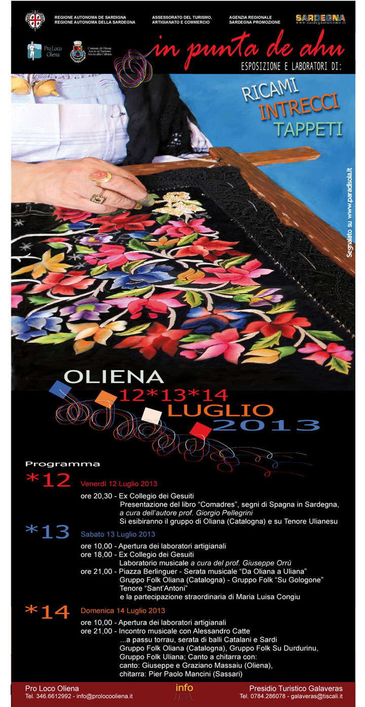 “In punta de ahu” (in needle) is the event scheduled for July 12 to 14. Organize Pro site, in collaboration with the Municipality of Oliena, the Regional Department of Tourism, and the regional agency and Sardinia promotion. For the organizers, it is a time of active exploitation that takes place mainly in the practical demonstration of the art of embroidery.