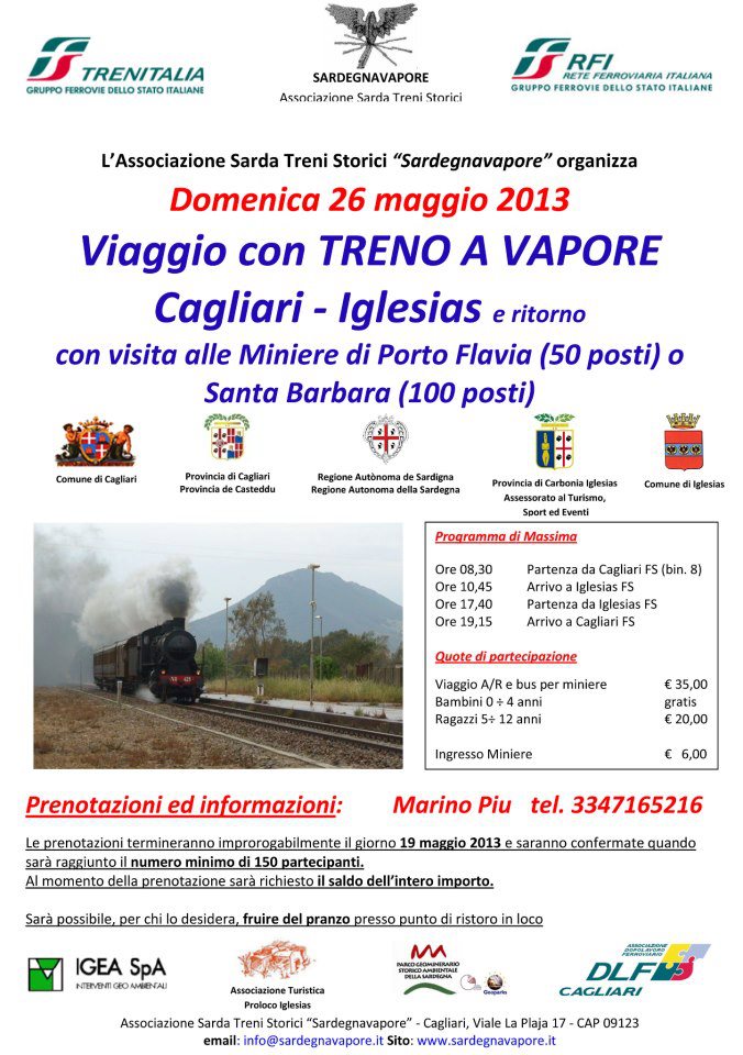 L’Associazione Sarda Treni Storici SARDEGNAVAPORE comunica che domenica 26 maggio 2013 il Treno Storico a vapore con le carrozze d’epoca del 1909/1910 arriverà ad Iglesias per accompagnare 150 viaggiatori per la visita dei siti minerari di :