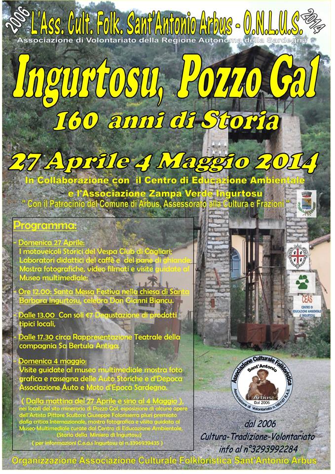 Tutto pronto per la 1^ iniziativa promossa per i 166 anni della storia di Ingurtosu. Vi aspettiamo tutti a Pozzo Gal per rivivere l’epoca mineraria e i percorsi di vita dei nativi di quella frazione. Da Ingurtosu passando per Pirreddu, Gennamari, e tanti altri insediamenti abitativi che hanno segnato la storia degli abitanti di Arbus e non solo; Noi, il Ceas e l’ass. Zampa Verde Ingurtosu “Per non dimenticare”; 27 Aprile 4 Maggio miniere di Ingurtosu dal 1848 al 2014, la storia continua.