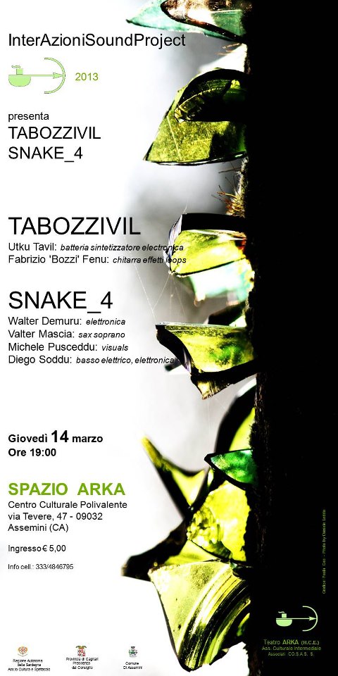 INTERAZIONI 2013 – TABOZZIVIL MEETS SNAKE 4 – SPAZIO ARKA – ASSEMINI – GIOVEDI 14 MARZOINTERAZIONI 2013 – TABOZZIVIL MEETS SNAKE 4 – SPAZIO ARKA – ASSEMINI – THURSDAY MARCH 14 Reviewed by admin on . InterAzioni SoundProject 2013 S P A Z I O A R K A Presenta TABOZZIVIL Meets SNAKE_4 TABOZZIVIL Utku Tavil: batteria _ sintetizzatore _ electronica Fabrizio 'Boz InterAzioni SoundProject 2013 S P A Z I O A R K A Presenta TABOZZIVIL Meets SNAKE_4 TABOZZIVIL Utku Tavil: batteria _ sintetizzatore _ electronica Fabrizio 'Boz Rating: