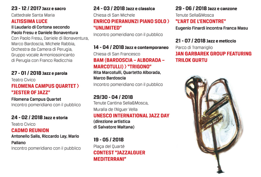 jazz-alguerSi comincia il 23 dicembre con il Laudario​ ​di​ ​Cortona​ ​​arrangiato da Paolo Fresu e Daniele​ ​di​ ​Bonaventura ed eseguito in quartetto insieme all’Orchestra da Camera di Perugia e al ​​Gruppo vocale Armonioso​incanto. Enrico Pieranunzi, Filomena Campus, Cadmo, B.A.M., Eugenio Finardi, Franca Masu e Jan Garbarek gli altri protagonisti della rassegna in programma fino al 21 luglio 2018.