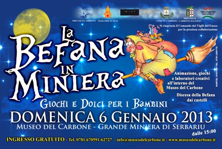 LA BEFANA IN MINIERA – MUSEO DEL CARBONE – CARBONIA – DOMENICA 6 GENNAIOTHE EPIPHANY IN MINE – CARBONE MUSEUM – CARBONIA – SUNDAY JANUARY 6 Reviewed by admin on . Domenica 6 Gennaio 2013, dalle ore 15.00 Giochi e dolci per i bambini Animazione, giochi e laboratori creativi all'interno del Museo del Carbone Discesa della B Domenica 6 Gennaio 2013, dalle ore 15.00 Giochi e dolci per i bambini Animazione, giochi e laboratori creativi all'interno del Museo del Carbone Discesa della B Rating:
