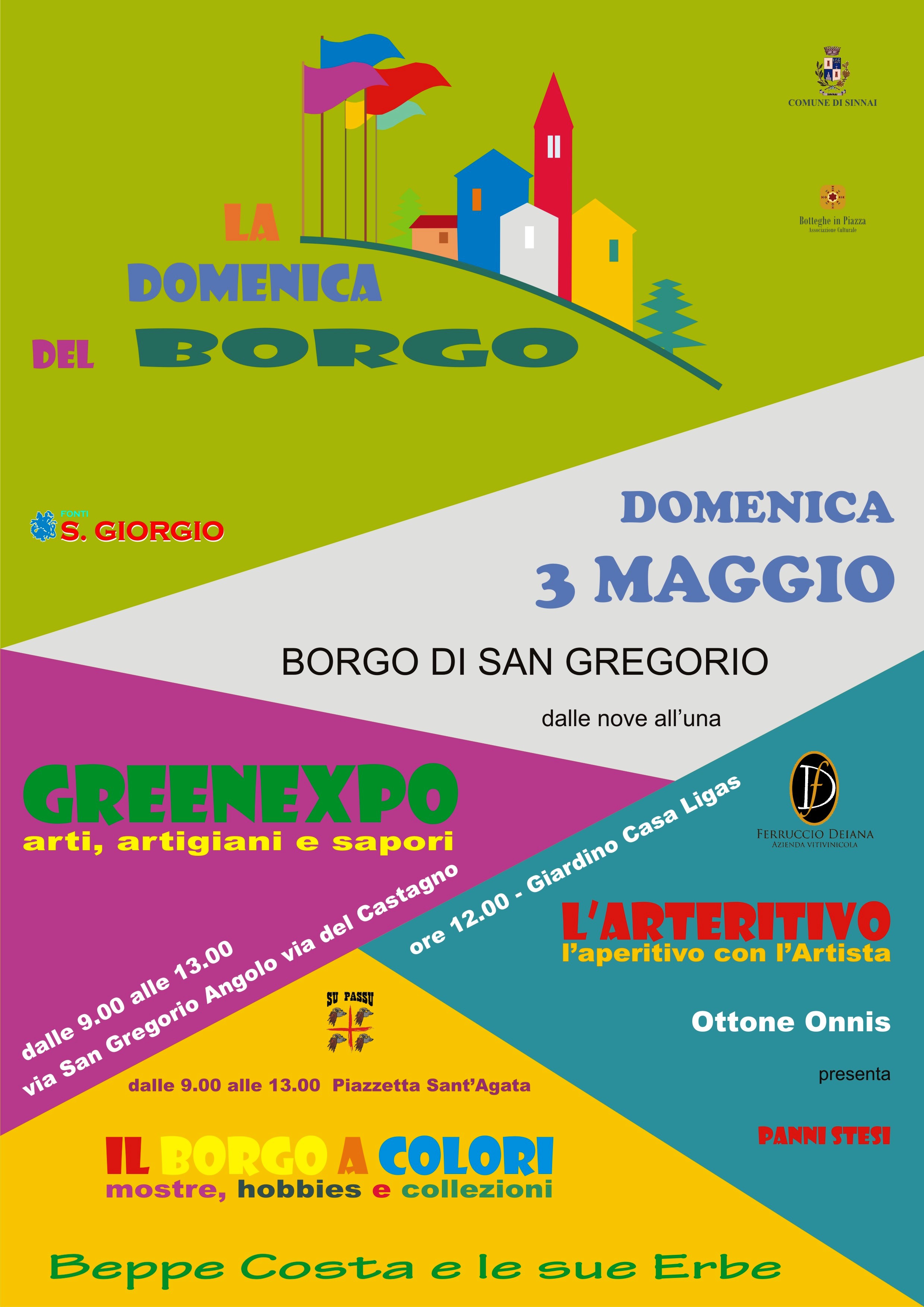 Ogni prima domenica del mese,questo mese domenica 3 maggio, l’appuntamento è con La Domenica del Borgo a San Gregorio, ai piedi dei Monti Sette Fratelli, un contenitore di mostre ed esposizioni d’arte, artigianato e sapori del territorio circostante.