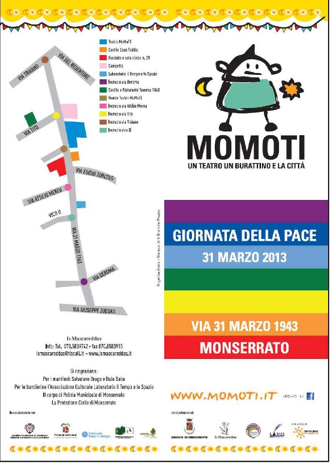 Domenica 31 marzo Monserrato celebra il settantesimo anniversario dei bombardamenti che la semidistrussero e provocarono la morte e il ferimento di decine di civili. In occasione della ricorrenza, che quest’anno coincide con la festivitĂ della Pasqua, in sintonia con il clima di fratellanza e di solidarietĂ ispirato dalla festivitĂ religiosa, il Progetto MOMOTI: un teatro, un burattino e la cittĂ , con il patrocinio del Comune di Monserrato, promuove nella cittadina dell’hinterland cagliaritano la Giornata della Pace: un’intera serata, in programma dalle 16 alle 20.30, con performance, mostre, laboratori dislocati lungo tutta la via 31 marzo 1943, sede oggi del Teatro MoMoTI gestito da Is Mascareddas. Un’occasione per non dimenticare e per riunire in un luogo così significativo per la comunitĂ di Monserrato, come la via intitolata alla data dei bombardamenti, gli abitanti, i gruppi e le associazioni locali.