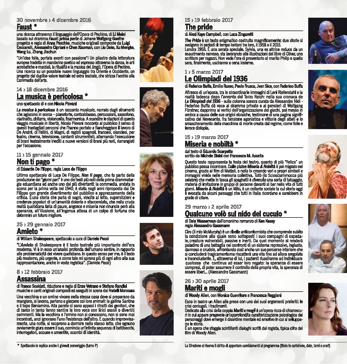 Sarà una Stagione che renderà omaggio a grandi Artisti che hanno scritto, interpretato e vissuto di e per il teatro: “La musica pericolosa” di e con Nicola Piovani che racconta il suo incontro con Fellini, De André e Vincenzo Cerami; “Non ti pago” l’ultima pièce in cui è stato protagonista Luca De Filippo preso in mano dall’amico Gianfelice Imparato; “Amleto” di Shakespeare con Daniele Pecci e Maddalena Crippa; Enzo Vetrano e Stefano Randisi faranno conoscere le parole di Franco Scaldati con “Assassina”, accompagnati in scena dalle note dei fratelli Mancuso; Michele Sinisi porta una sua originale versione di “Miseria e nobiltà” di Scarpetta. La seconda parte della Stagione presenterà tre modi differenti di affrontare tematiche legate all’intolleranza civile, religiosa, sessuale e sociale: “The pride” di A. Campbell con Luca Zingaretti; “Le Olimpiadi del 1936” con Federico Buffa e “Qualcuno volò sul nido del cuculo” diretto da Alessandro Gassmann. Infine, una novità assoluta sarà “Mariti e mogli” di Woody Allen con la versione di Monica Guerritore accompagnata da Francesca Reggiani.