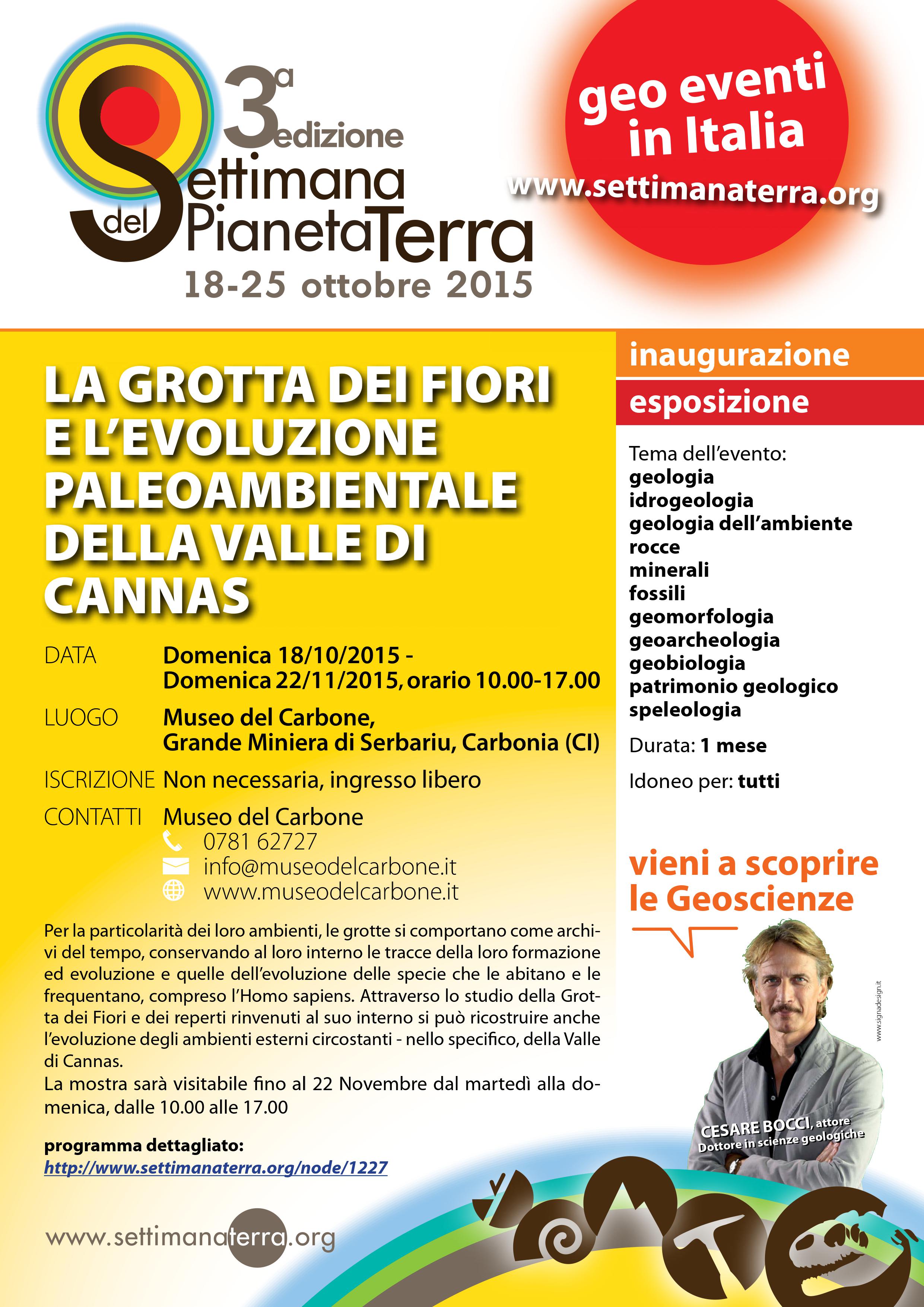 LA GROTTA DEI FIORI E L’EVOLUZIONE PALEOAMBIENTALE DELLA VALLE DI CANNAS – DOMENICA 18 OTTOBRE 2015 Reviewed by admin on . Il Museo del Carbone aderisce alla III edizione della Settimana del Pianeta Terra - L’Italia alla scoperta delle Geoscienze, che si svolgerà quest’anno dal 18 a Il Museo del Carbone aderisce alla III edizione della Settimana del Pianeta Terra - L’Italia alla scoperta delle Geoscienze, che si svolgerà quest’anno dal 18 a Rating: 0