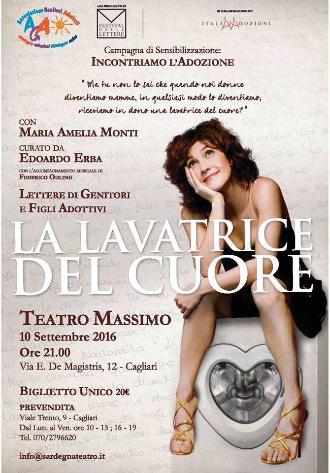 Sabato 10 Settembre 2016, per la prima volta in Sardegna, porteremo lo spettacolo teatrale “La lavatrice del cuore – Lettere di genitori e figli adottivi”, una produzione del Festival delle Lettere in collaborazione con Italia Adozioni, scritto da Edoardo Erba e interpretato da Maria Amelia Monti, attrice di cinema, teatro e televisione , entrambi “genitori adottivi”.