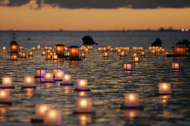 Cerimonia di tōrō nagashi: scrittura del proprio messaggio, accensione delle candele e messa in acqua delle lanterne di carta, accompagnata dalla recitazione benaugurale del sutra del cuore (Hannya Shin Gyo) secondo la tradizione del buddhismo Zen.