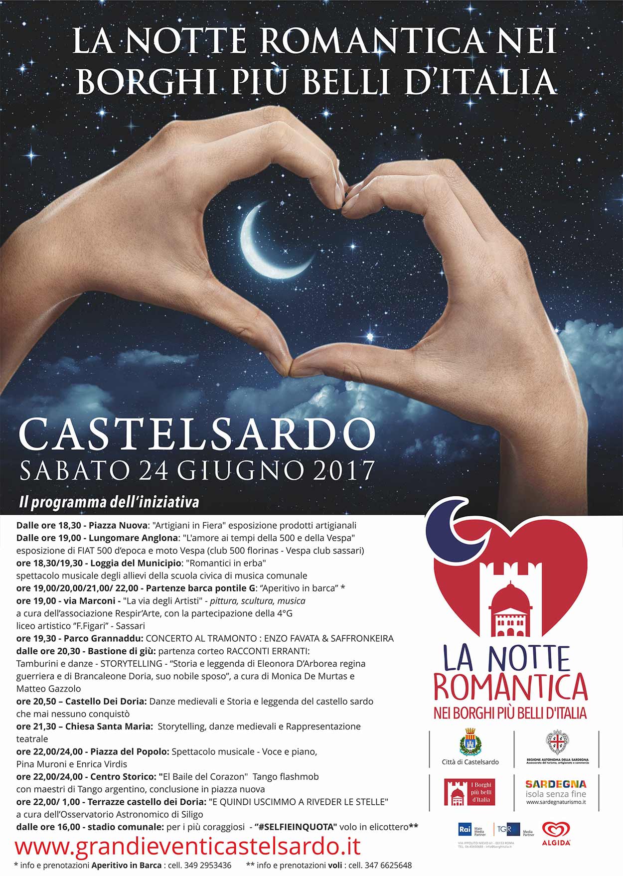 Ritorna a Castelsardo la “Notte Romantica dei borghi più belli d’Italia”, iniziativa che inaugura l’estate celebrando l’amore con un’immersione nell’atmosfera medievale dell’antica città regia. Il programma valorizza la bellezza del borgo storico realizzando una preziosa cornice di iniziative: mostre d’arte, concerti al tramonto, rievocazioni epiche, danze medievali, storytelling teatrali che narrano struggenti amori cavallereschi e appuntamenti dedicati alla più romantica delle visioni: il cielo stellato. Alla sua seconda edizione “la notte romantica”, diventa un evento internazionale, oltre alla maggior parte dei 271 borghi italiani certificati, vi partecipano anche i borghi delle omologhe associazioni spagnola e belga. A sostenere “la notte romantica” anche sponsor d’eccezione: la Rai ed il cornetto Algida, legato da sempre all’immaginario romantico dell’estate, che suggella l’importanza di un evento candidato a diventare nei prossimi anni una sorta di San Valentino estivo.