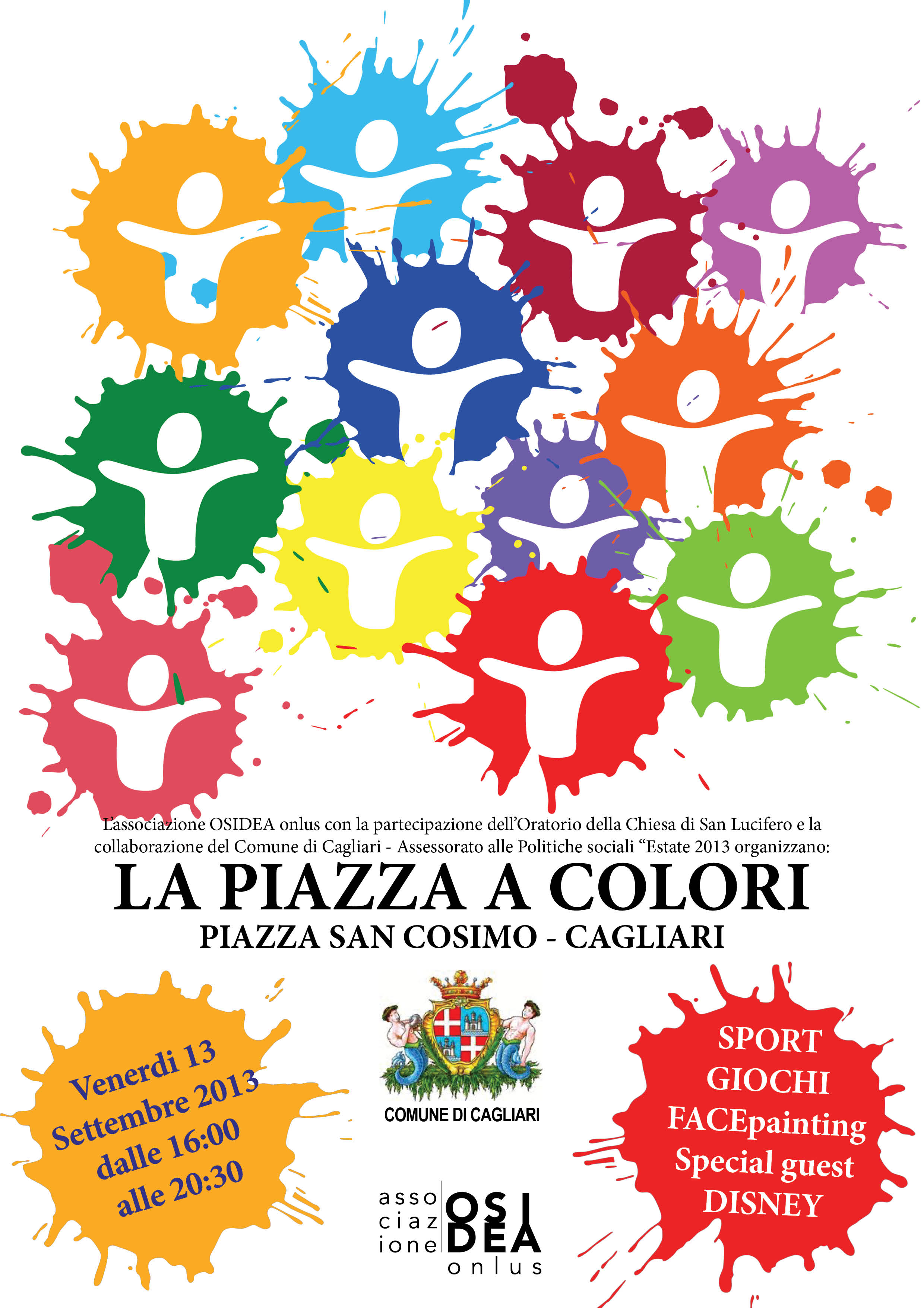 Nell’ambito della manifestazione “Estate 2013” dell’Assessorato alle politiche sociali dalle 16.00 alle 20.30. Organizza l’Associazione Osidea onlus con la partecipazione dell’Oratorio della Chiesa di San Luciferoposter_finaleSports, games, facepainting and special guest Disney, Friday 13 September in Piazza San Cosimo with “The square in color.”