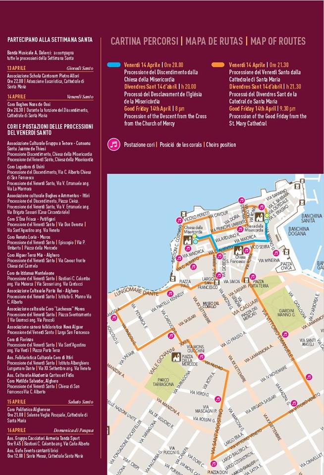 Percorso: Cattedrale di Santa Maria, Via Santa Barbara, Via Cavour, via Don Deroma, Via P. Umberto, Via G.Ferret, Via Cavour, Bastioni C. Colombo, Via C. Alberto, Via G. Ferret, Largo San Francesco, Via Kennedy, Piazza Sulis, Lungomare Dante, Via Gramsci, Via Pascoli, Via Sassari, Via Carducci, Piazza della Mercede, Via Nuoro, Via S. Agostino, Via V. Veneto, Via V. Emanuele, Via Roma, Via C. Alberto, Via G. Ferret, Via P. Umberto, Chiesa della Misericordia.