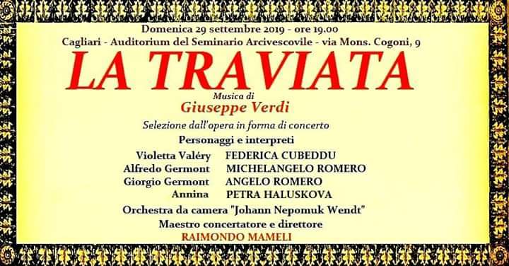 Selezione da La Traviata di Verdi, in forma di concerto, con Federica Cubeddu, Petra Haluskova, Michelangelo e Angelo Romero, Orchestra da camera Wendt, direttore Raimondo Mameli. Il costo del biglietto (disponibile da inizio settembre) è di 12 €; sono previsti sconti per i giovani sino a 25 anni e sopra i 65 anni. Per i gruppi di persone (minimo 10 per gruppo) è prevista sempre una riduzione sul costo del biglietto. INFO: 3772929079 (sms o whatsapp) / orchestra.wendt@gmail.com