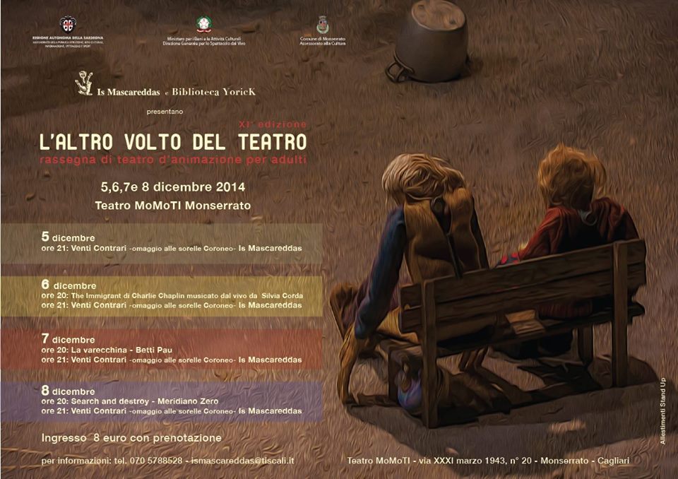 Le quattro repliche di “Venti contrari” (da venerdì 5 a lunedì 9, con ingresso alle 21, a 8 euro, con prenotazione telefonica al numero 070 58 39 742 o tramite mail all’indirizzo ismascareddas@tiscali.it) sono inserite nell’undicesimo cartellone della rassegna “L’Altro volto del teatro”. Oltre a Venti Contrari, il consueto appuntamento di Is Mascareddas dedicato agli adulti si completa – da sabato 6 a lunedì 8 dicembre nel teatro in via 31 marzo 1943 — di altri tre spettacoli, tutti alle 20 in apertura di serata (con biglietto di 8 euro per l’ingresso all’intera serata). Sabato 6 è in programma la proiezione del film di Charlie Chaplin “The Immigrant” (1917, 25 minuti), musicato dal vivo dalla pianista Silvia Corda al toy piano, harmonium indiano e oggetti sonori. Domenica 7 spazio alla lettura teatrale della narratrice Elisabetta Pau dal titolo “La varecchina”, frammenti di vita raccontati per ripercorrere insieme al pubblico scorci di tempo passato e presente e i mutamenti dati dal passare degli anni. Lunedì 8 tocca allo spettacolo “Search and Destroy” di Meridiano Zero, secondo atto della trilogia “B-Tragedies” che la compagnia di Sassari dedica a Shakespeare, incentrato sulla figura di Amleto, di e con Marco Sanna, accompagnato in scena da Massimo Casada.