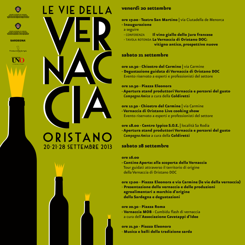 La riscoperta di un vino dalle origini antiche attraverso eventi, degustazioni e incontri che lo facciano conoscere al grande pubblico. E’ questo l’obiettivo della manifestazione “Le vie della vernaccia”, vino sardo di alta qualità tipico della zona dell’Oristanese, che si terrà a Oristano e nelle zone di produzione limitrofe dal 20 al 28 settembre 2013.