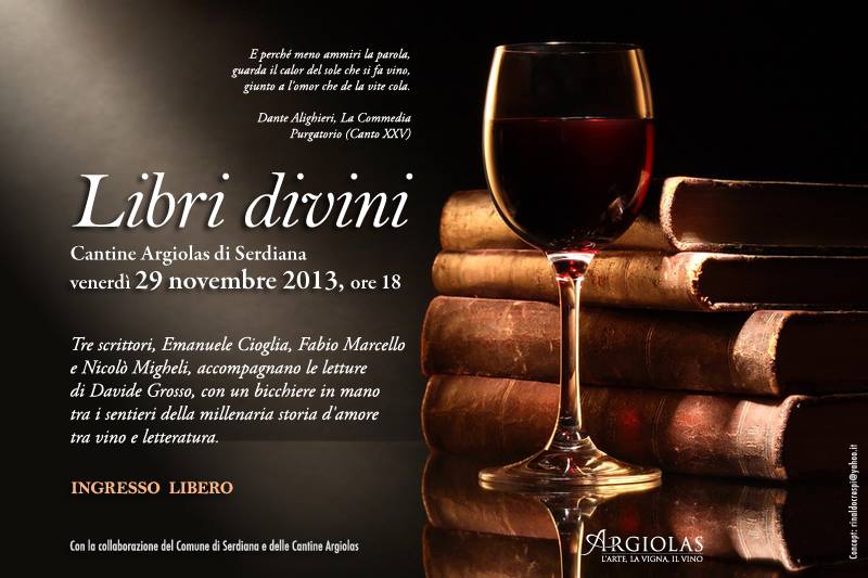 LIBRIDIVINIVenerdì 29 novembre alle cantine Argiolas, a Serdiana, a partire dalle 18 Nicolò Migheli, Emanuele Cioglia e il sottoscritto vi accompagneremo per le vie del millenario legame tra letteratura e vino. Con noi, Davide Grosso alle letture, accompagnate dalle musiche del maestro Felice Cassinelli.LIBRIDIVINIFriday, November 29 to wineries Argiolas, in Serdiana, starting at 18 Nicholas Migheli, Emanuele Cioglia and myself will accompany you through the streets of the millennium link between literature and wine. With us, David Grosso to the readings, accompanied by the music of the master Happy Cassinelli.