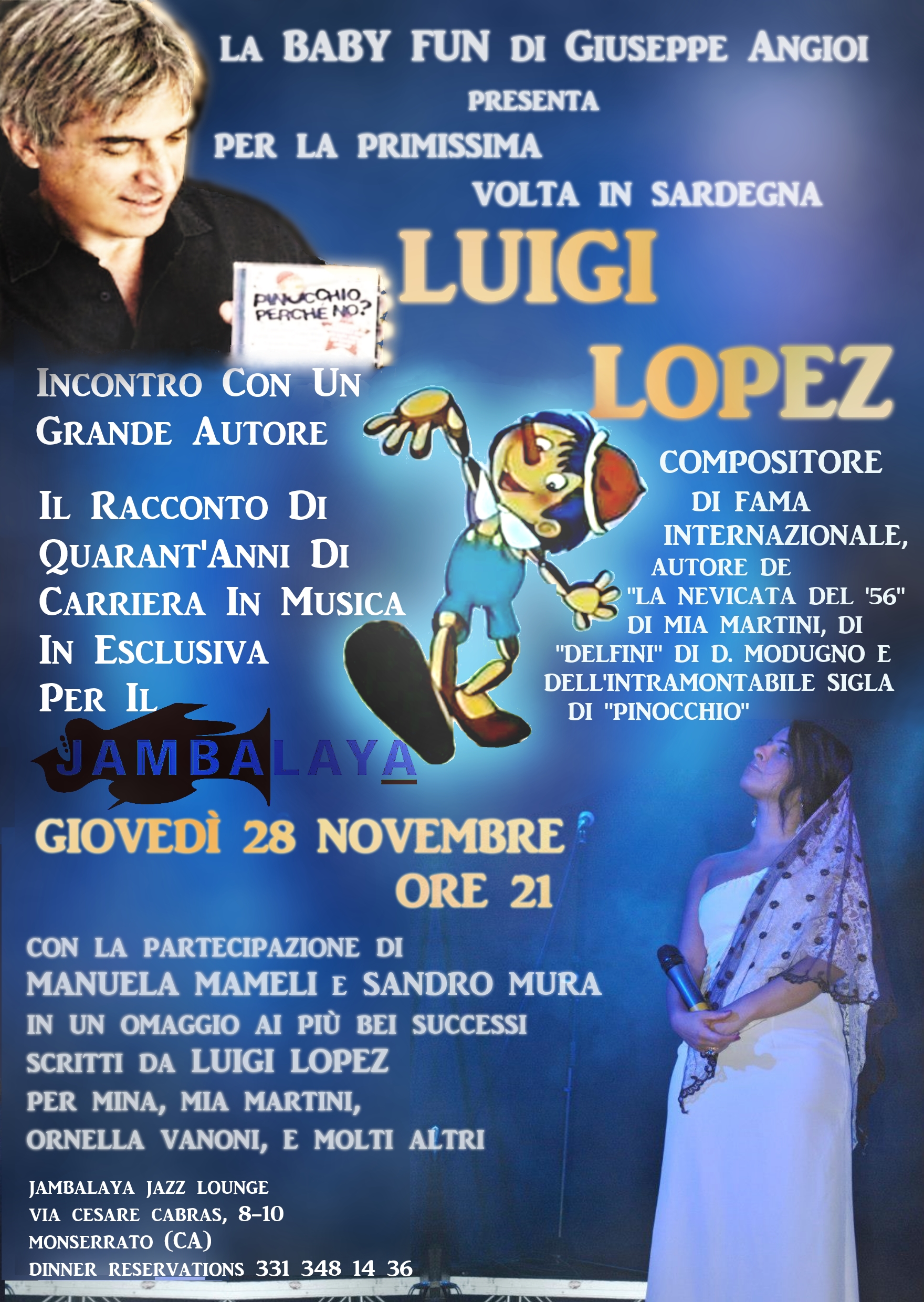 Per la prima volta in Sardegna nell’arco della sua quarantennale carriera, ospite d’eccezione Giovedì 28 Novembre al Jambalya Jazz Lounge, LUIGI LOPEZ, compositore di fama internazionale, autore di innumerevoli successi tra cui “La nevicata del ’56” portata alla ribalta da Mia Martini, “Delfini” di Domenico Modugno e l’intramontabile sigla del cartone animato di Pinocchio, motivo canticchiato universalmente da tre generazioni di bambini e da bambini ormai più cresciuti, che non possono perciò perdere quest’…occasione di radunarsi allo Shakespeare Beach per quest’evento unico e senza precedenti.