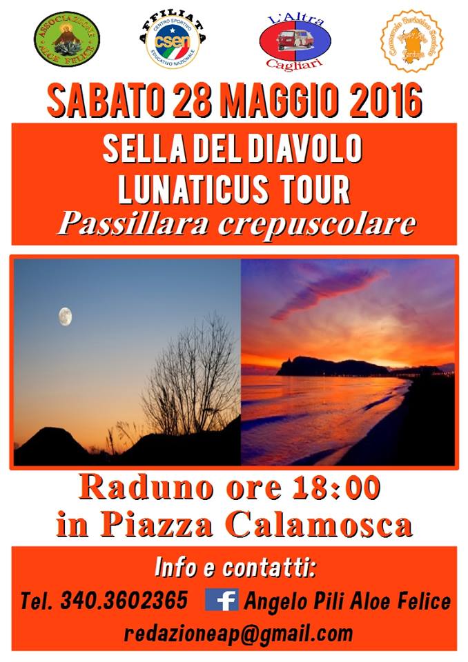 Le associazioni Aloe Felice e L’Altra Cagliari, organizza per sabato 28 maggio, “LUNATICUS TOUR, PASSILLARA CREPUSCOLARE ALLA SELLA DEL DIAVOLO”. Questo, è il primo appuntamento culturale tematico sulla Luna, satellite della terra, che toccherà tutte le sommità dei colli piu’ alti, di Cagliari.
