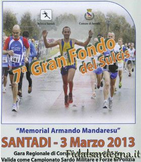 Organizzata dalla Società Atletica Santadi, con la collaborazione del Comune di Santadi, dalla Libera Associazione Anziani di Santadi, dalla locale Pro-Loco, dall’Esercito Italiano – I° Regimento Fanteria Corazzata di Teulada, della Cantina di Santadi, dall’Ente Foreste della Sardegna e con l’approvazione del Comitato Regionale della Fidal Sardegna, e con la collaborazione straordinaria dei biker’s “I Pedali Santadesi”, si correrà domenica 3 marzo la VII Edizione della “Gran Fondo del Sulcis” gara regionale di Corsa in montagna valida come Campionato Regionale Assoluto di Corsa in Montagna e come Campionato Regionale di Corsa in Montagna riservato alle Forze Militari e di Polizia. La manifestazione è intitolata anche alla memoria di Armando Mandaresu indimeticato atleta di Nuxis, pluricampione italiano scomparso il 1 novembre 2007 per un male incurabile.