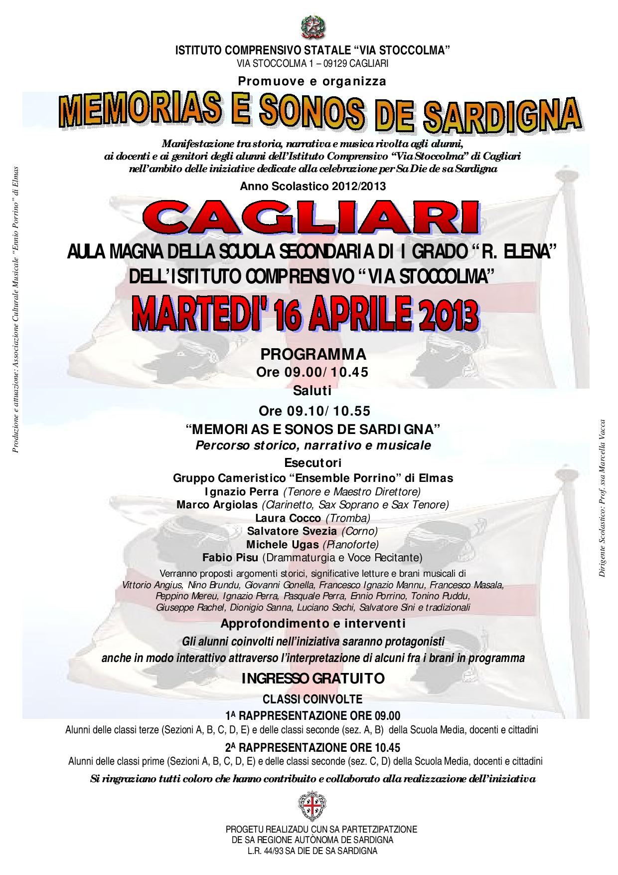 Martedì 16 aprile 2013 a Cagliari (presso l’Aula Magna della Scuola Media dell’Istituto Comprensivo “Via Stoccolma”) con inizio alle ore 09.00 si terrà l’iniziativa “MEMORIAS E SONOS DE SARDIGNA” consistente in una manifestazione tra storia, narrativa e musica finalizzata ad approfondimenti e riflessioni sulle vicende storiche del popolo sardo, anche in relazione alla contemporaneità, proposta in forma di seminario – rappresentazione che prevede l’interazione di varie forme di elaborazione e di espressioni artistiche e culturali con esibizioni musicali e narrazioni a tema e mira ad una rievocazione storica del periodo (fine XVIII secolo e inizi del XIX secolo) nel quale si colloca l’allontanamento da Cagliari dei Piemontesi (28 aprile 1794), pure con spunti che possano correlarla a fatti e/o personaggi dei giorni nostri partendo dalla specifica tematica inerente al ruolo dei cittadini cagliaritani nelle vicissitudini inerenti a Sa die de sa Sardigna. La manifestazione suddetta sarà rivolta a scopo divulgativo – culturale e formativo agli alunni, ai docenti e ai genitori degli alunni dell’Istituto Comprensivo “Via Stoccolma” di Cagliari. Il progetto artistico – culturale “MEMORIAS E SONOS DE SARDIGNA” (che prevede anche attività formativo – preparatorie, rivolte agli alunni e ai docenti dell’Istituto Comprensivo “Via Stoccolma” di Cagliari e ai genitori degli alunni) è promosso dall’Istituto Comprensivo “Via Stoccolma” di Cagliari con il contributo della R.A.S. (Assessorato della Pubblica Istruzione, Beni Culturali, Informazione, Spettacolo e Sport – Servizio Lingua e Cultura Sarda, Editoria e Informazione), ai sensi della L.R. 14.09.1993, n. 44, nell’ambito delle manifestazioni dedicate alla celebrazione per “Sa Die de sa Sardigna”.