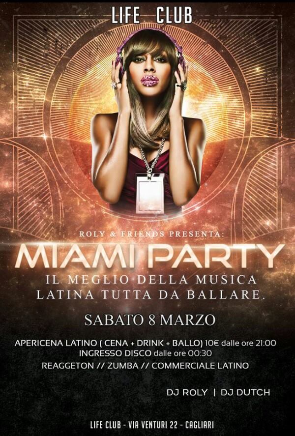MIAMI PARTY – LIFE CLUB (EX GO FISH) – CAGLIARI – SABATO 8 MARZO 2014MIAMI PARTY – LIFE CLUB (EX GO FISH) – CAGLIARI -SATURDAY MARCH 8,2014 Reviewed by admin on . Serata dedicata agli amanti della musica LATINA. Dalle ore 21.00 APERICENA LATINO (cena+drink+ballo) 10euro. Ballerete in compagnia delle migliori scuole di bal Serata dedicata agli amanti della musica LATINA. Dalle ore 21.00 APERICENA LATINO (cena+drink+ballo) 10euro. Ballerete in compagnia delle migliori scuole di bal Rating: