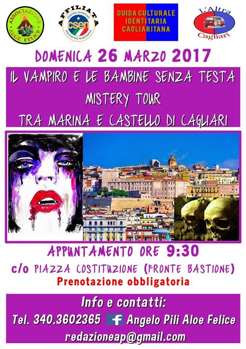 L’associazione Aloe Felice insieme con L’Altra Cagliari, organizza per domenica 26 marzo, sa passillara casteddaia: ” IL VAMPIRO E LE BAMBINE SENZA TESTA-MISTERY TOUR TRA MARINA E CASTELLO DI CAGLIARI”. Le storie nere, saranno svelate passeggiando per le antiche viuzze karalitane della città vecchia.