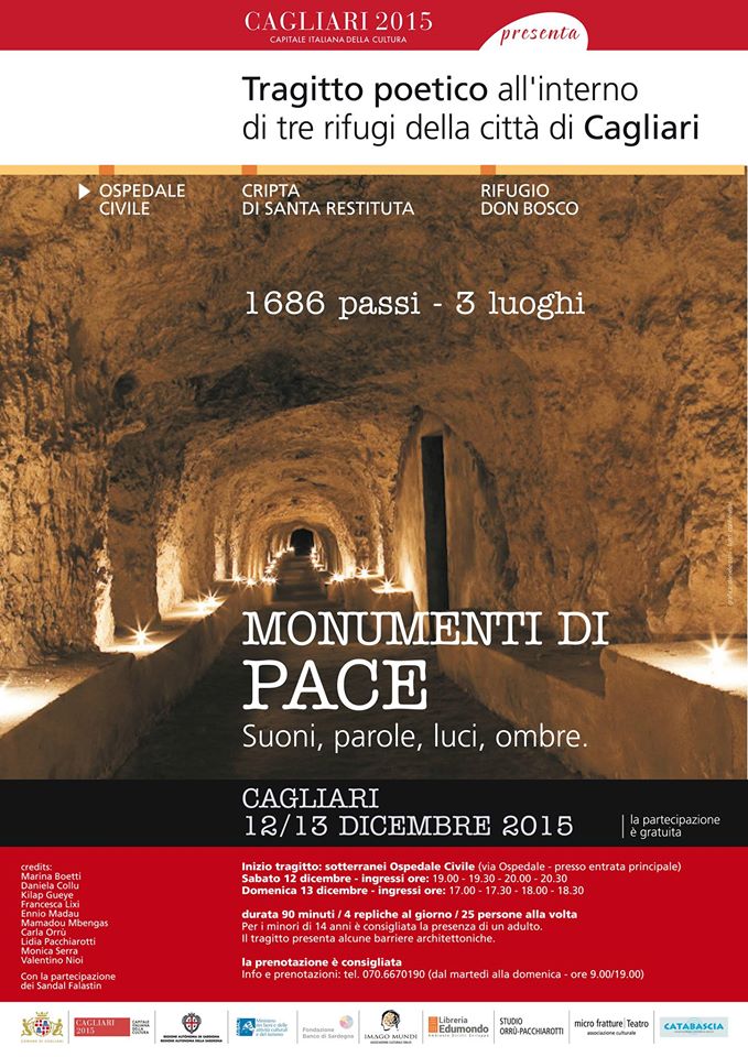 Monumenti di Pace è un itinerario che si snoda in tre punti significativi della cittĂ di Cagliari. Tre luoghi segnati dall’esperienza del conflitto e divenuti luoghi di rifugio durante le incursioni aeree della seconda guerra mondiale. Un itinerario a tre tappe che dai sotterranei dell’Ospedale Civile, porta il visitatore alla Cripta di Santa Restituta fino al rifugio Don Bosco. Un percorso fatto di parole, suoni, testimonianze, immagini, spazi, luce e buio, nel silenzio e nell’ascolto. Come in “marcia” verso una meta, ci si sposta nei tre luoghi per un momento di riflessione sulla pace e l’armonia fra i popoli insieme a chi vive in prima persona l’esodo e la migrazione. La pace intesa quindi come apertura, come ascolto, come dialogo. Dialogo di parole ma anche di musiche provenienti da diverse aree culturali e linguistiche. Dalle poesie e parole di Joyce Lussu, Náşzim Hikmet, Agostinho Neto, Miklòs Radnòti, Bertold Brecht, JosĂ© Craveirinha, Ho Chi Minh, alle musiche dei Sandalya Falestine e alle testimonianze di chi vive sulla propria pelle l’esperienza della fuga e la ricerca di una meta. Tre luoghi, tre performance da unire in un’unica piccola “marcia” intesa non in senso militaresco ma in senso di “cammino forzato”, come quello che si trovano a subire i migranti nella fuga e in ricerca di un nuovo approdo.Tutto lo spettacolo è pensato per una fruizione ATTIVA del visitatore. Non va quindi concepita come una classica visita guidata del monumento in quanto tale, ma come un’esperienza in grado di suscitare emozioni e suggestioni sul tema della pace.