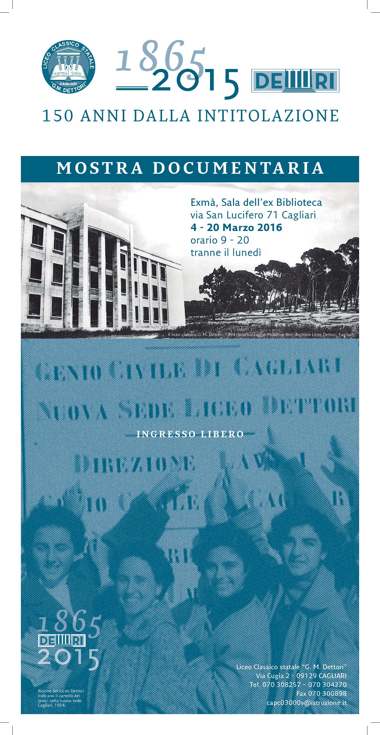 A conclusione delle celebrazioni del 150° Anniversa rio dall’intitolazione a Giovanni Maria Dettori, il Liceo Classico “Dettori” allestis ce una mostra documentaria che si inaugurerà venerdì 4 marzo alle ore 17 nella Sala d ell’ex Biblioteca dell’Exma’ di Cagliari.