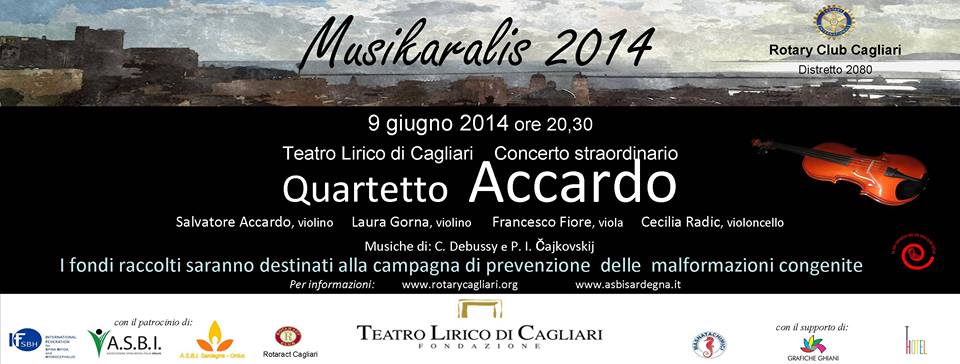 Quest’anno MusiKaralis è uno straordinario concerto del prestigioso Quartetto Accardo organizzato dal Rotary Club Cagliari al fine di raccogliere fondi e consensi a favore della campagna regionale di prevenzione delle malformazioni congenite, sostenuta dai Rotary Club della Sardegna insieme all’Asbi Sardegna (www.campagnarotary.it).