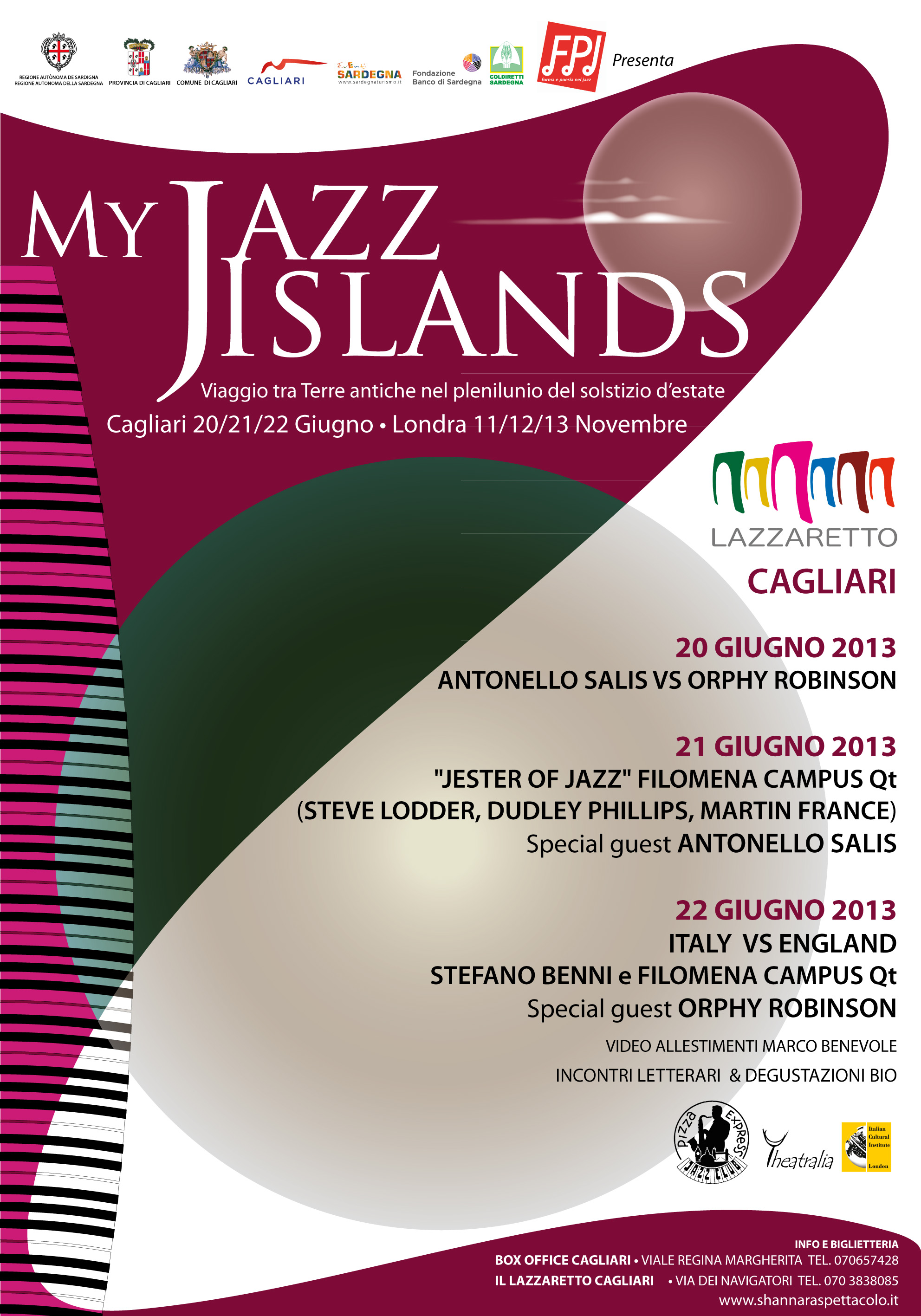 The first edition of My Jazz Islands, new project quality weblog Form and Poetry in Jazz, is organized in Cagliari with the contribution of the Autonomous Region of Sardinia (Department of Education, Sport and Entertainment and Department of Tourism) and the Province of Cagliari . For the part of London, the organization instead of Filomena Campus in collaboration with the Pizza Express Jazz Club Soho and the contribution of the Italian Institute of Culture in London.