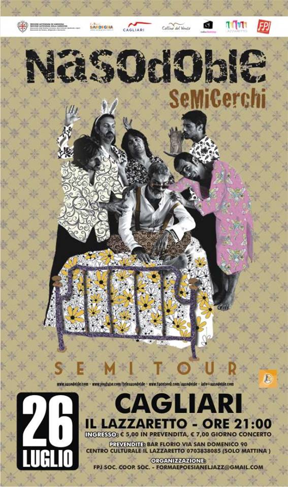 Il 26 luglio alle ore 21.30 presso il Lazzaretto concerto dei Nasodoble. Ingresso € 5.00 in prevendita e € 7.00 il giorno del concerto. I biglietti sono acquistabili presso il Bar Florio via san Domenico 90, presso il Centro Culturale Il Lazzaretto 0703838085 (solo mattina) La band Sassarese presenterà il loro ultimo lavoro “Se mi cerchi” che comprende anche la Hit ” Cazz Boh” . Un lavoro corale dai tratti fortemente poetici caratterizzato dalla voce marcata dell’istrionico Alessandro Carta, con dei testi forti e dalle tematiche sociali molto vicine alla nostra isola. I NASODOBLE nascono nel 2004 in Sardegna. È un progetto che si può catalogare nei