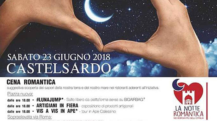 Il prossimo sabato, 23 giugno 2018, nei “Borghi più belli d’Italia“, si festeggerà l’arrivo del solstizio d’estate con la terza edizione della “Notte Romantica“, una serata speciale dedicata agli innamorati, tra appuntamenti appositamente pensati per le coppiette in luoghi particolarmente suggestivi, deliziosi menù a tema nei piccoli ristorantini negli angoli e nelle piazze più affascinanti dei comuni aderenti all’associazione che in Sardegna sono Castelsardo, Carloforte, Bosa, Atzara e Posada