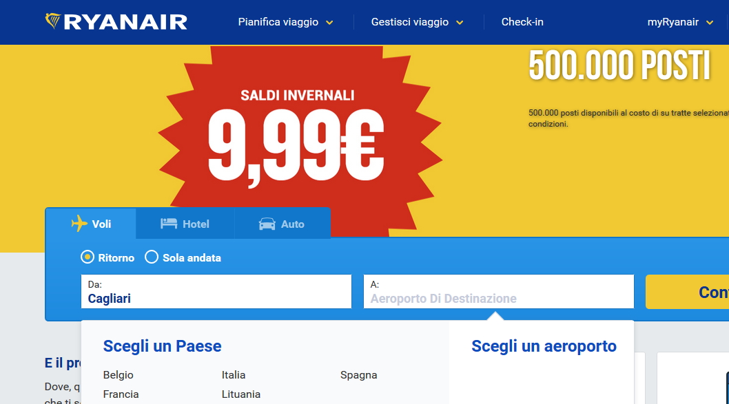 NUOVO SITO RYANAIR, 500.000 BIGLIETTI A 9,99 €