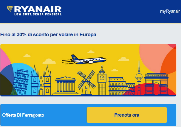 OFFERTA DI FERRAGOSTO : 30% SCONTO SU TUTTI I VOLI RYANAIR