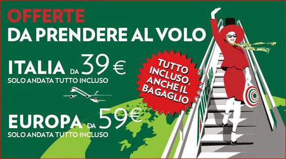 OFFERTE ALITALIA DA PRENDERE AL VOLO: ITALIA DA 39 €; EUROPA DA 59 €ALITALIA OFFERS : ITALY FROM 39 €; EUROPE FROM 59 € Reviewed by admin on . La compagnia aerea Alitalia ha appena lanciato un'interessante promozione che consente di volare in Italia a partire da soli 39€ a tratta ed in Europa (ad esclu La compagnia aerea Alitalia ha appena lanciato un'interessante promozione che consente di volare in Italia a partire da soli 39€ a tratta ed in Europa (ad esclu Rating: 0