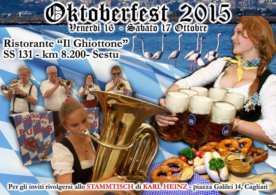 oktoberfest2015ghiottoneAnche quest’anno il Circolo “Stammtish di Karl Heinz, il Comando Addestramento Tattico Aeronautica Militare Tedesca di Decimomannu e l’ Associazione “Amici Tedeschi in Sardegna” organizzano l’ Oktoberfest 2015 a Cagliari che avrà luogo per due serate di seguito tra tavolate, birra e tanta musica tedesca.