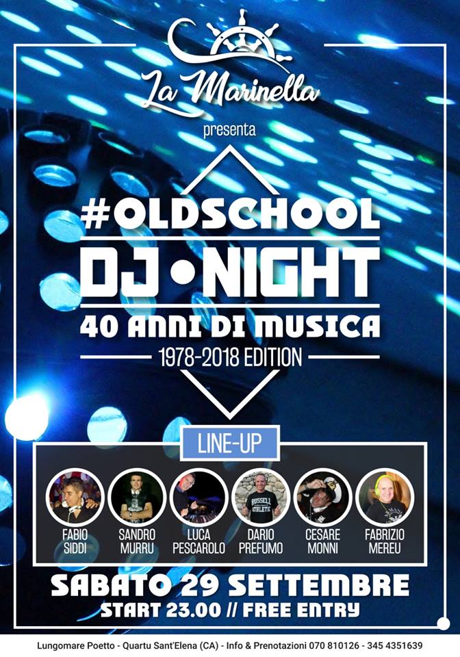 OLD SCHOOL DJ NIGHT – LA MARINELLA – QUARTU SANT’ELENA – SABATO 29 SETTEMBRE 2018 Reviewed by admin on . SABATO 29 SETTEMBRE Start 23.00 Le grandi hit che hanno fatto la storia dal 1978 al 2018 selezionate da una line-up di 6 Djs che si alterneranno in consolle per SABATO 29 SETTEMBRE Start 23.00 Le grandi hit che hanno fatto la storia dal 1978 al 2018 selezionate da una line-up di 6 Djs che si alterneranno in consolle per Rating: 0