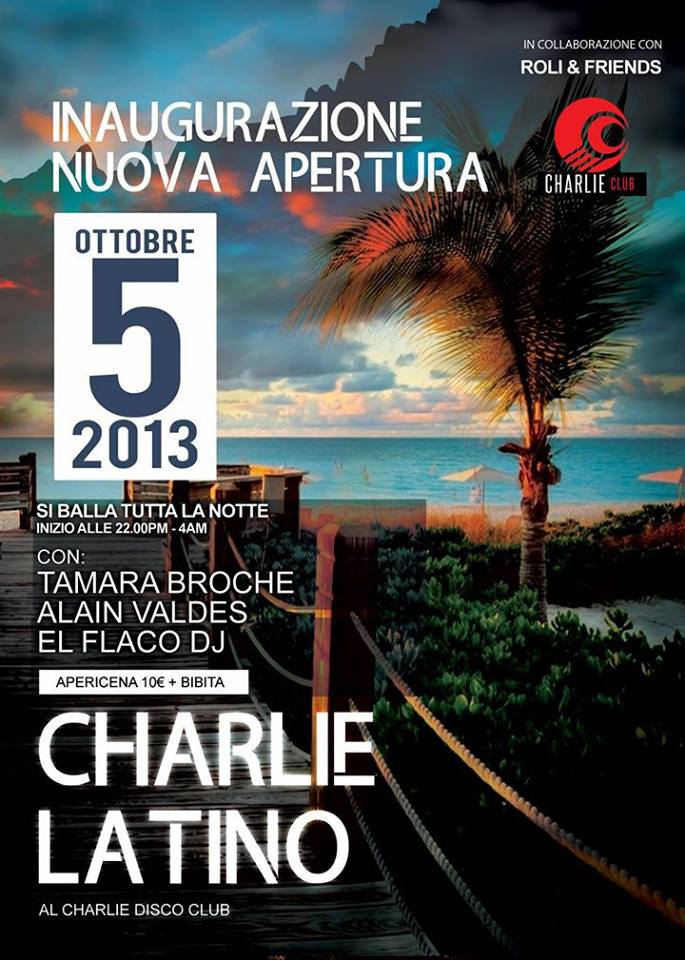 Sabato 5 ottobre 2013 inaugurazione della sala CHARLIE LATINO, al Charlie disco club, si balla tutta la notte a partire dalle ore 22 con Tamara Broche, Alain Valdes e El flaco dj.