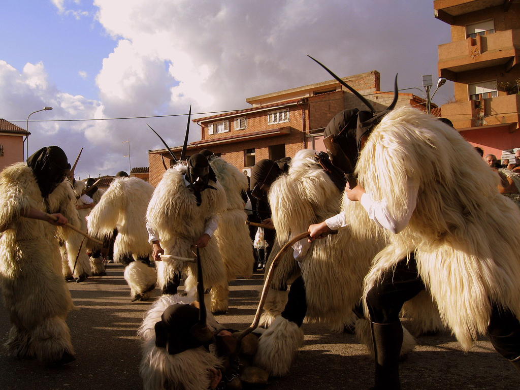 “Son maschere che ti mascherano, liberando le tue pulsioni piu’ recondite…” Vinicio Capossela Il Carnevale di Ottana affonda le sue radici in tempi antichissimi e perpetua una tradizione mai interrotta, mettendo in risalto il passato e l’identità culturale della comunità che ha le sue origini nel mondo agro pastorale. Le maschere descrivono, attraverso spontanee interpretazioni estemporanee che si sviluppano in una sorta di canovaccio, personaggi, ruoli e le innumerevoli situazioni della vita dei campi, quali l’aratura, la semina, il raccolto, nonché la cura, la domatura, la malattia, la morte degli animali. Il Carnevale costituisce una delle ricorrenze più attese dalla popolazione ottanese che da sempre partecipa in maniera spontanea e s’identifica nella ricchezza culturale e nel profondo senso di appartenenza alla propria cultura. La caratteristica principale del Carnevale è data dalle particolari maschere de Sos Merdules che rappresentano, genericamente, con questo unico termine, le maschere de Sos Boes e di altri animali, quali: Porcos, Molentes, Crapolos. Il Carnevale che con le sue maschere per tre giorni impazza per le vie del paese, a partire dalla domenica di quinquagesima, fino al martedì che precede il mercoledì delle ceneri, inizia in realtà la sera del 16 gennaio, festa di Sant’Antonio Abate, quando, dopo la funzione religiosa che termina con la benedizione del falò (su Ogulone) in piazza, le maschere fanno la loro prima uscita e si radunano intorno al fuoco. È in questa occasione che il sacerdote consegna “S’Affuente”, un piatto di rame lavorato a sbalzo con motivi decorativi e una scritta in caratteri alemanni (si presume di origine celtica), utilizzato anche durante i riti della Settimana Santa (lavanda dei piedi e per mettere i chiodi che vengono tolti al Cristo il venerdì Santo durante la cerimonia de “S’iscravamentu”, deposizione dalla Croce). Il piatto diventa uno strumento musicale che percosso verticalmente con una grossa chiave dà il ritmo al ballo tipico di Ottana, l’antico “Ballu de S’Affuente”. Altri strumenti musicali sono “s’òrriu”, un cilindro di sughero con la parte superiore ricoperta da un pezzo di pelle di animale dal quale pende una correggia che, intrisa di pece e fatta scorrere all’interno con la mano, produce un suono roco e prolungato che spaventa le bestie e disarciona i cavalieri; “su pipiolu”, uno zufolo realizzato con canna palustre. Un altro aspetto significativo della tradizione del carnevale è costituto da alcune specialità alimentari tipiche, quali “sas gazzas” di cui si è già parlato; “sas savadas” (dolce di formaggio filante ricoperto di pasta, fritto nell’olio bollente e servito con il miele e/o con lo zucchero); “sa pasta violada” (dolce di pasta lavorata con lo strutto, fritta nell’olio bollente), “sas origliettas” (dolce di pasta sottilissima tagliata a striscioline, fritto nell’olio bollente e condito con il miele. Inoltre, “sos culurzones” (ravioli) di formaggio e/o di ricotta, “sa galadina” (gelatina di carne di maiale) e ancora salsicce, prosciutto, pane “carasau”, formaggio