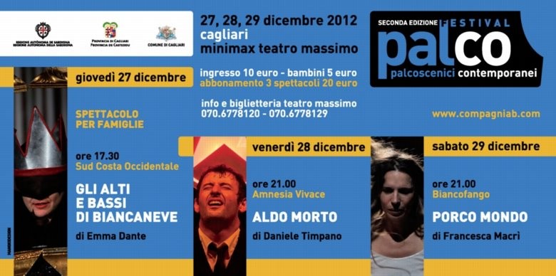 Dopo il successo di pubblico registrato la scorsa estate nella tre giorni nel Parco di Monteclaro, con oltre tremila spettatori, dal 27 al 29 dicembre la Compagnia B organizza, questa volta nel “Ridotto†del Teatro Massimo di Cagliari, la seconda edizione di PalCo – Palcoscenici Contemporanei. La formula di questa edizione, visti i pesanti tagli ai finanziamenti ma nell’ottica di una continuità artistica, propone tre appuntamenti con alcune delle più interessanti realtà del teatro contemporaneo italiano: Emma Dante e il suo Gli alti e bassi di Biancaneve (adatto anche a un pubblico di bambini dai cinque anni in su), Daniele Timpano (finalista Premio UBU), in scena con Aldo Morto, e la compagnia Biancofango in Porco Mondo, scritto da Francesca Macrì e Andrea Trapani, tutti presentati in anteprima per la Sardegna.