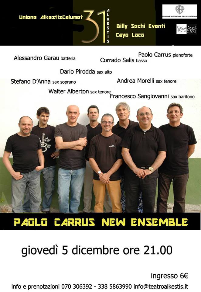 At 21:00 on Thursday, December 5, 2013 , at the Teatro Alkestis Cagliari (via Loru 31) , will perform the CARRUS PAUL NEW ENSEMBLE with Paul Carrus (piano), Corrado Salis (bass), Alessandro Garau (drums ), Joe Murgia (alto sax ), Dario Pirodda (alto sax ), Andrea Morelli ( tenor sax) , Walter Alberton ( tenor sax) and Francesco Sangiovanni ( baritone sax ) .