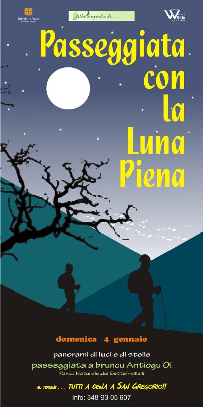 PASSEGGIATA CON LA LUNA PIENA – DOMENICA 4 GENNAIO 2015 Reviewed by admin on . DOMENICA 4 GENNAIO 2015 PASSEGGIATA CON LA LUNA PIENA E CENA A SAN GREGORIO (SINNAI, AREA 7 FRATELLI) Per il primo plenilunio del 2015 vi propongo una passeggia DOMENICA 4 GENNAIO 2015 PASSEGGIATA CON LA LUNA PIENA E CENA A SAN GREGORIO (SINNAI, AREA 7 FRATELLI) Per il primo plenilunio del 2015 vi propongo una passeggia Rating: 0