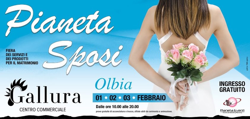 PIANETA SPOSI – OLBIA – 1-3 FEBBRAIO WEDDING PLANET – OLBIA – FEBRUARY 1 TO 3 Reviewed by admin on . Pianeta Sposi arriva ad Olbia, 1, 2 e 3 febbraio 2013! Le nuove proposte per il matrimonio presentate da tutte le professionalità che ruotano attorno al mondo d Pianeta Sposi arriva ad Olbia, 1, 2 e 3 febbraio 2013! Le nuove proposte per il matrimonio presentate da tutte le professionalità che ruotano attorno al mondo d Rating: